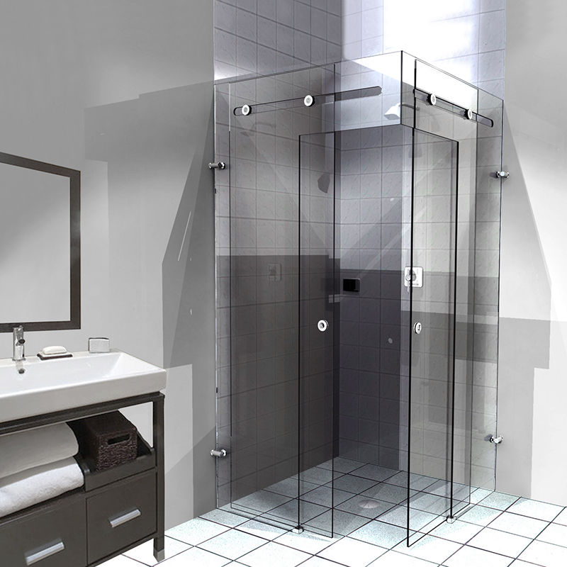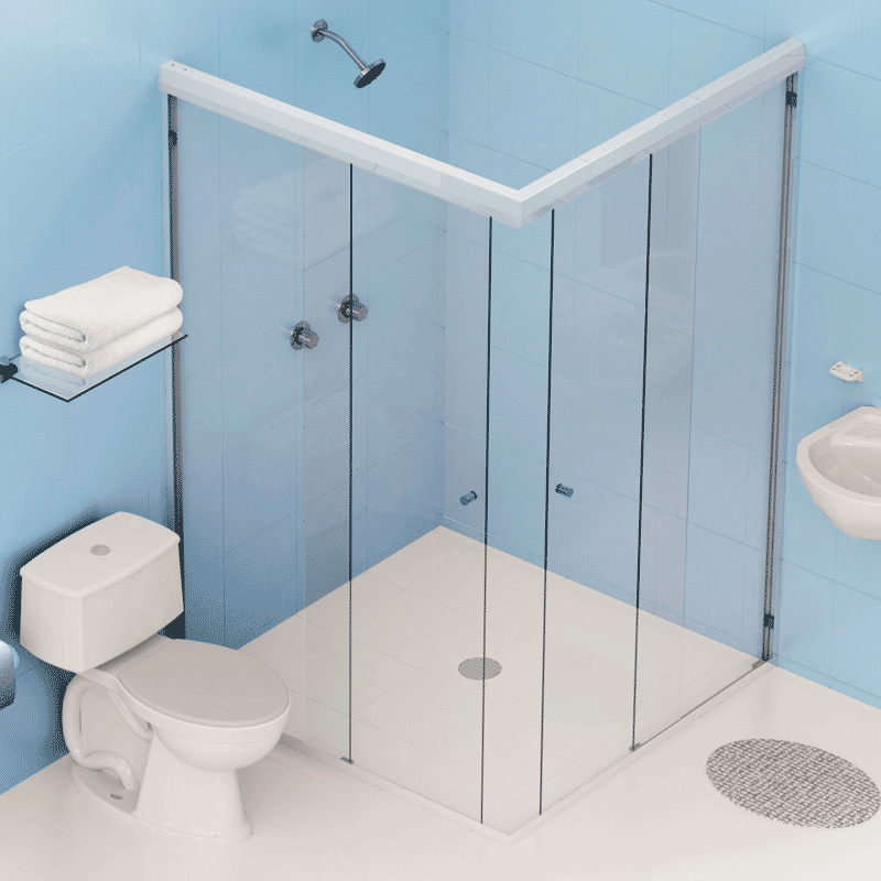 Cancel de baño corredizo en escuadra a 90° para cristal templado de 6mm, con estructura de aluminio extruido y jaladeras acabado cromo. Medida de línea: 0.90 x 0.90 x 1.85m