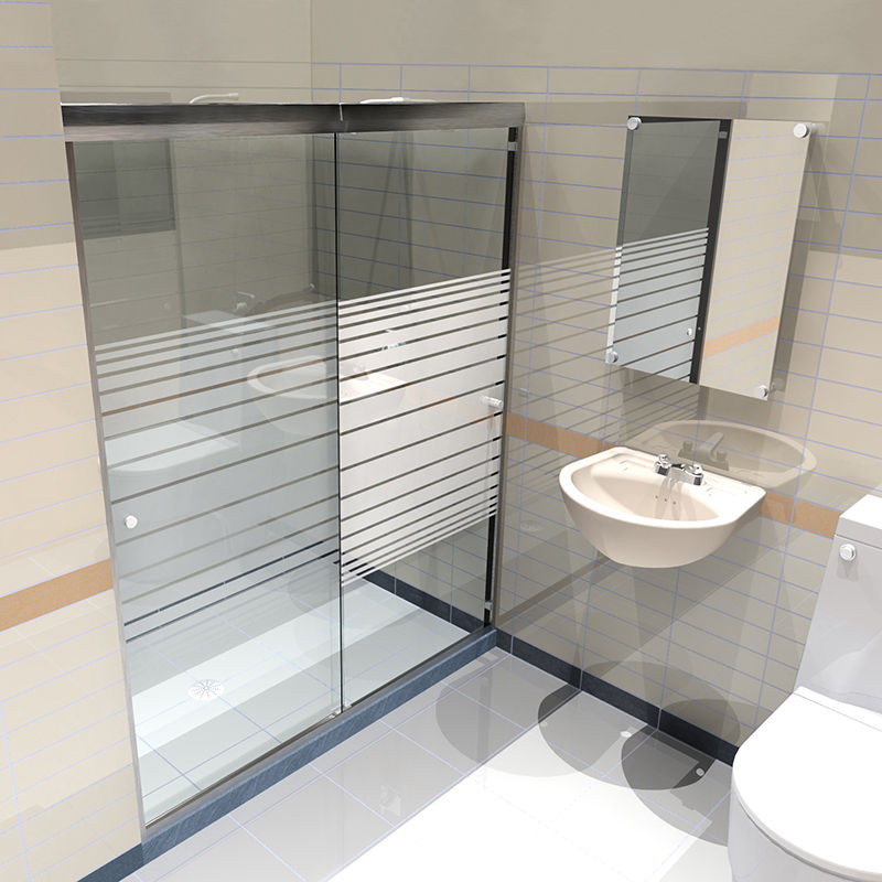 Cancel de baño doble corredizo para cristal templado de 6mm con opción transparente ó serigrafía, y perfiles de aluminio. Medidas de línea: 1.85 x 1.50m 1.85 x 1.80m 2.00 x 1.50m 2.00 x 2.00m